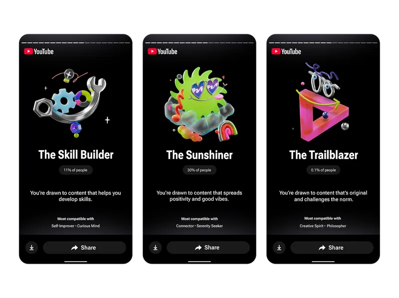 A BRAND FIRST FOR YOUTUBE WITH THE LAUNCH OF THEIR GLOBAL FIRST EVER ‘RECAP’ CAMPAIGN, I COLLABORATED WITH THE YT TEAM TO DESIGN AND BRING TO LIFE FOURTEEN ‘PERSONALITY CARDS’, CREATING COMMUNITIES FOR VIEWERS WITH SIMILAR LIKES AND HABITS. TASKED WITH CREATING UNIQUE CHARACTER-LIKE ANIMATIONS FOR EACH PERSONALITY TYPE, WE DEVELOPED A DIRECTION FOR EACH DESIGN THAT PEOPLE CAN RESONATE WITH AND RELATE TO.